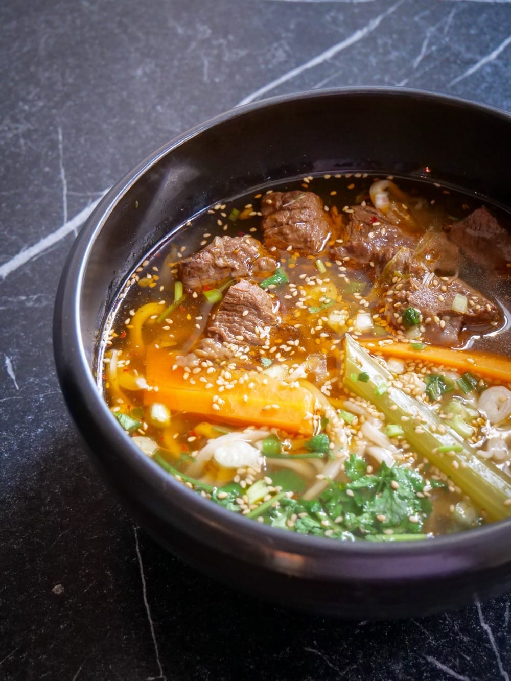 J’ai commencé par la soupe de nouilles au bœuf, commandée un peu au hasard… Quand le plat est arrivé, j’ai déjà compris qu’on était sur un niveau de cuisine. Le genre de cuisine de sensation, qui par l’aspect et les parfums qui se dégagent, vous séduit déjà. Loin d’être dans le « visuel », quand j’ai goûté ça a été clairement la belle surprise : un bouillon profond, une viande fondante, des saveurs parfaitement équilibrées. Les nouilles sont fabriquées sur place avec de la farine locale.