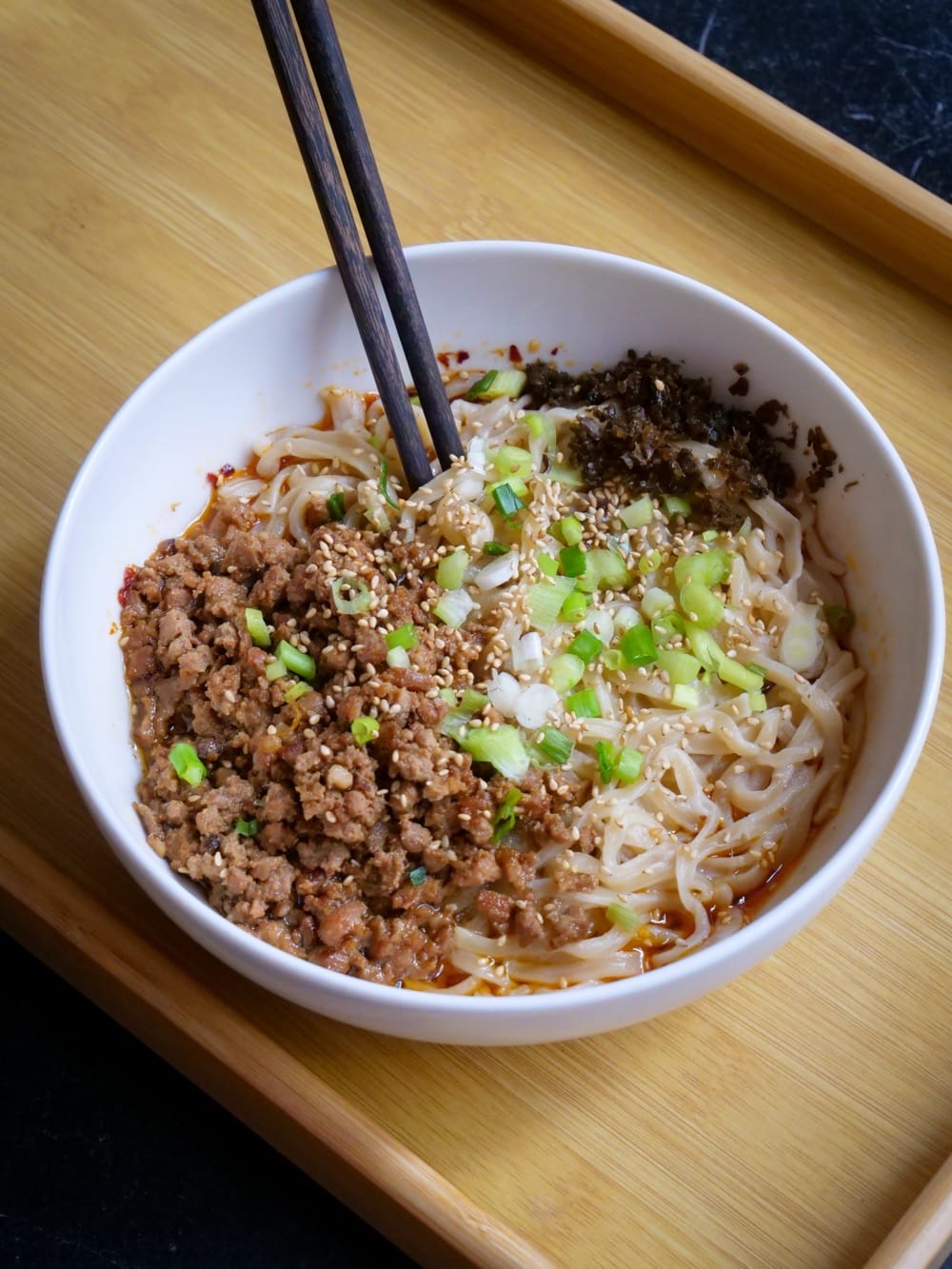 Autre plat emblématique de la maison, le Dan Dan Mian (plus facile à manger qu’à prononcer) mêle porc haché, pâte de sésame et cacahuète dans une sauce dense qui évolue à mesure qu’on mélange.
