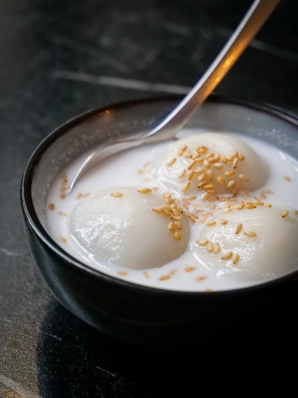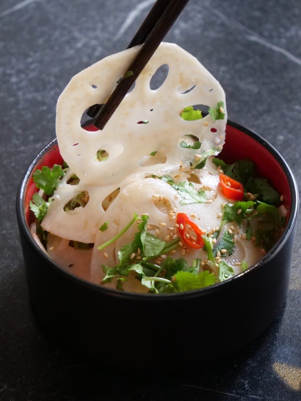 Même les entrées sortent du cadre attendu, comme cette salade de racines de lotus croquante et vive. On n’a pas l’habitude de manger ça et vraiment, ça change des carottes râpées !! Côté dessert, j’ai adoré les Tuang Yuan, sorte de boules de riz gluantes, fourrées au sésames, servies tièdes dans une sauce coco, fondantes, gourmandes et pas trop sucré, on finit en beauté.
