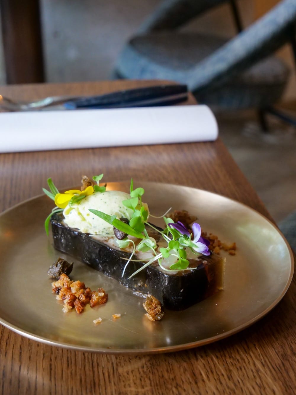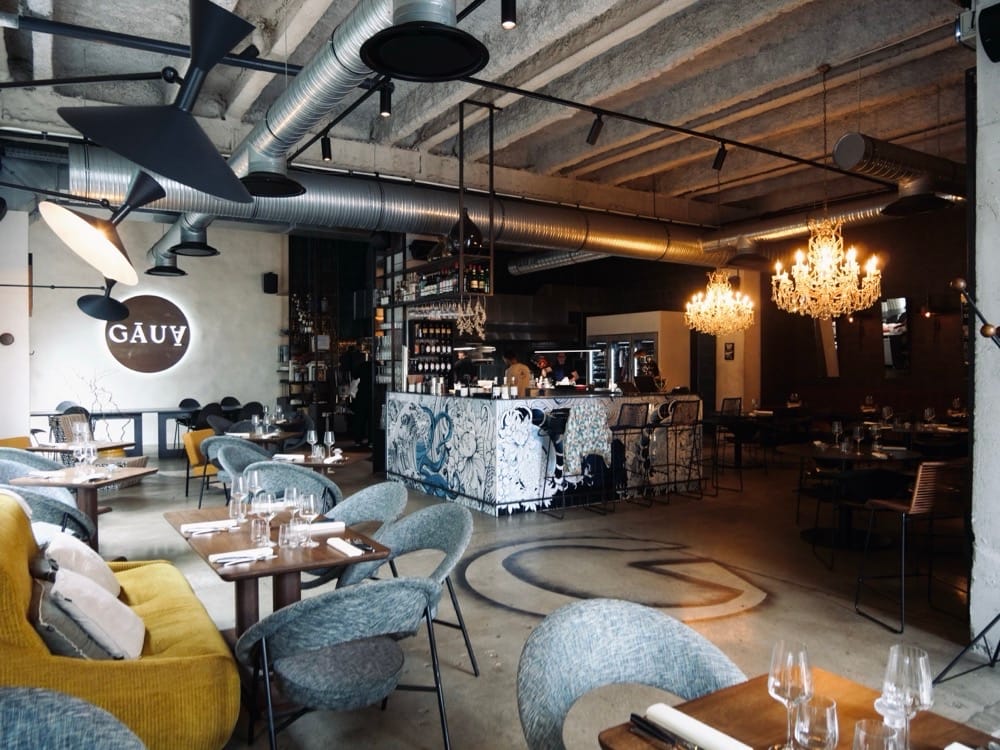 Gaua veut dire “la nuit” en basque : lumières feutrées, déco industrielle travaillée au millimètre, bar central qui vibre comme une scène, cuisine ouverte où tout s’anime sous vos yeux, pas de mur, on est en immersion dans un nouvel univers. On n’est pas vraiment dans un restaurant, on est dans une sorte de club de saveurs.
