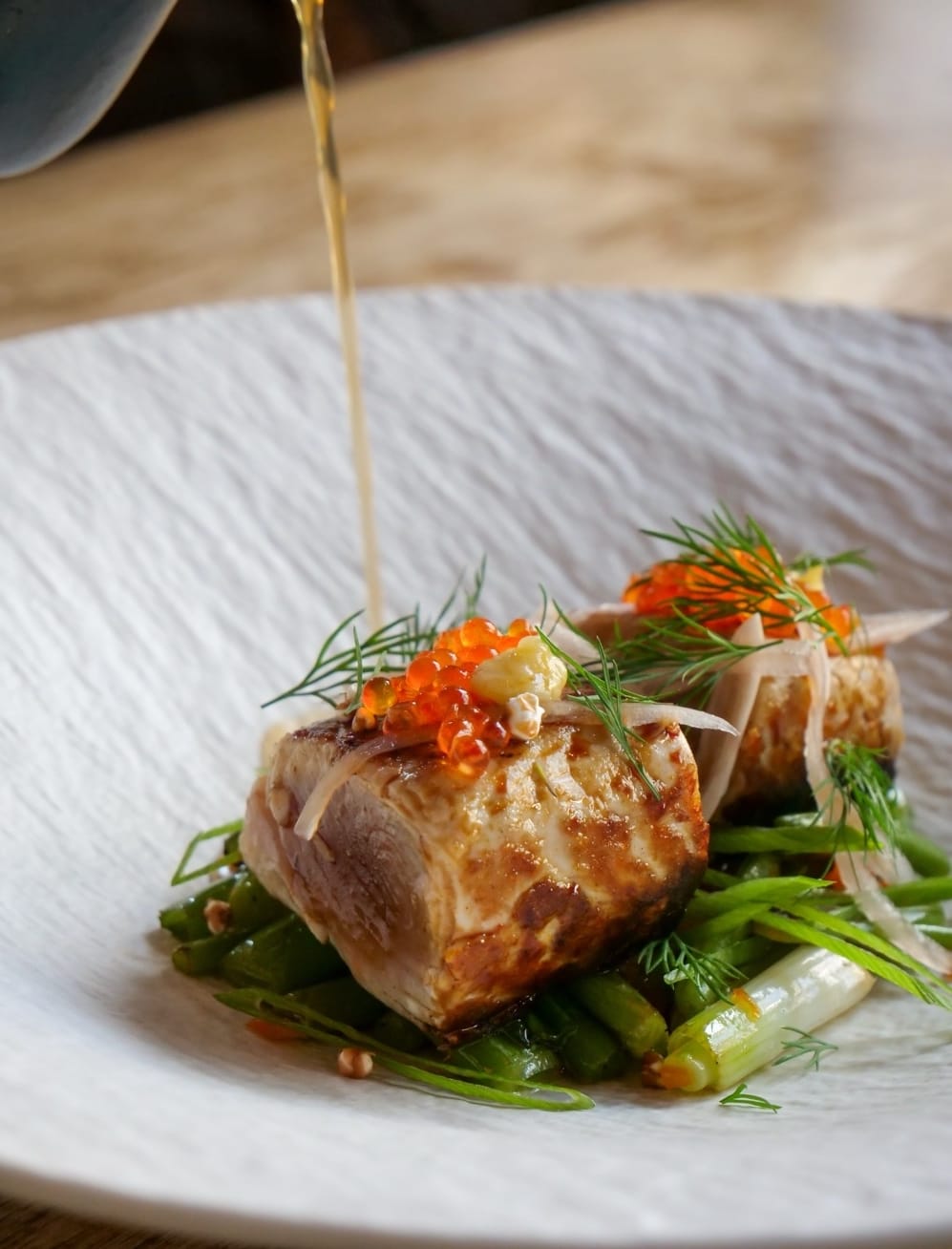 La bonite à la braise, laquée, dashi, haricots fumés, cébette, pickles d’échalote et condiment citron résume à elle seule l’esprit d’Amaé : finesse, profondeur, équilibre.