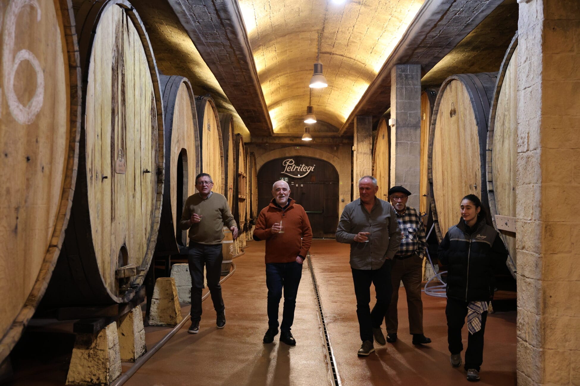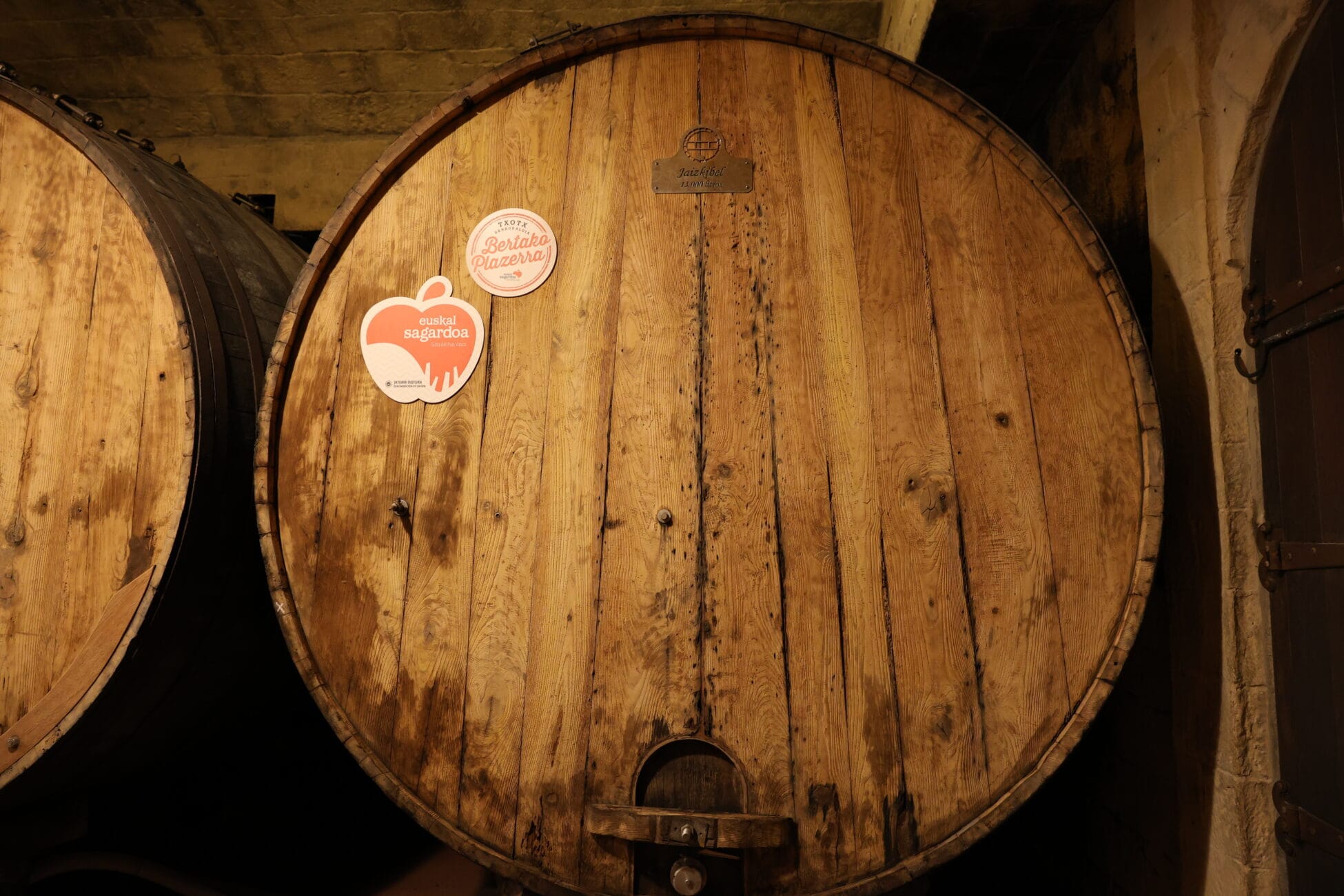 À un moment, j’ai quitté la table pour accompagner mes amis vers le txotx. Le txotx, c’est ce moment emblématique où l’on ouvre les tonneaux de cidre dans la cave, aux murs de pierre, et où chacun, d’un geste précis, se sert le cidre frais directement dans le bec du fût. Le cidre jaillit, vif, légèrement fruité, avec ce parfum vivant de pomme et de fermentation maîtrisée. C’est l’essence même de la sidrería basque : convivialité, gestes, partage, chaleur humaine, où chacun debout, verre à la main, profite du txotx fraîchement coulé.